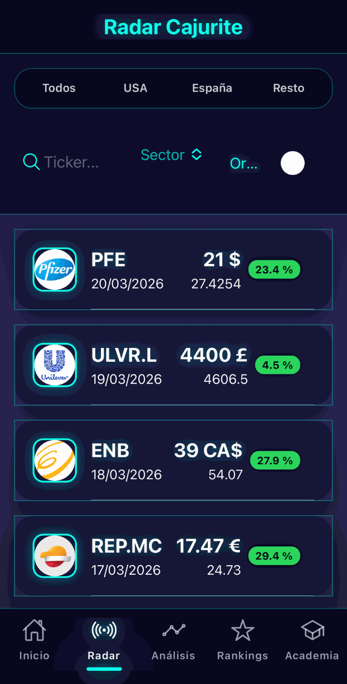 A tu disposición las mejores herramientas para invertir. Sin duda la estrella es nuestra APP Cajurite disponible para iOS y Android. Desde ella puedes seguir todos nuestros análisis de empresas, el radar con sus precios de entrada y todos los datos financieros.
