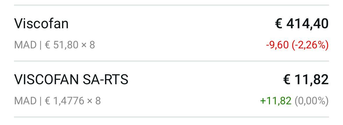 Captura de Degiro que es donde yo tengo Viscofan para que veáis cómo sale. Lo de abajo RTS son los derechos recibidos y que ahora cotizan 11,82€ los 8 derechos, es decir a 1,4775€ el derecho.